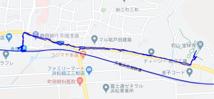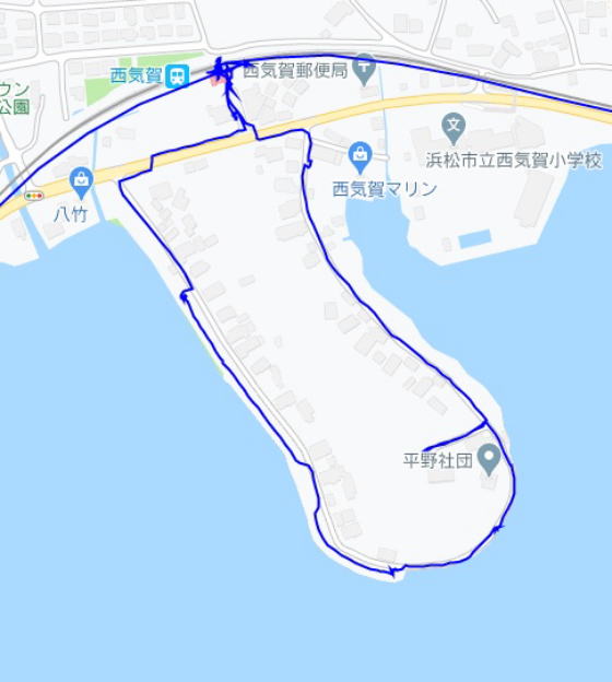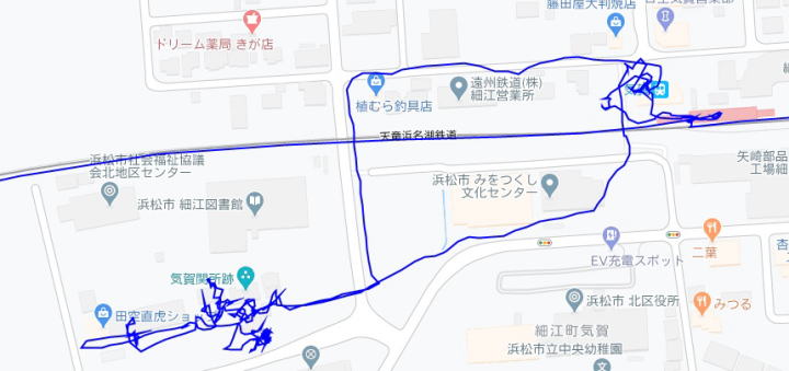 (気賀駅周辺の散策。 GPSロガーのログデータで実際に移動した場所の軌跡を表示)