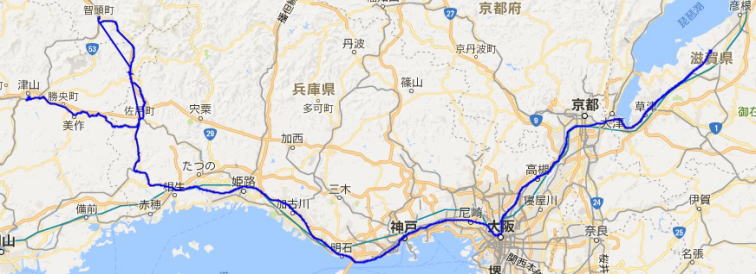 津山(市内散策)-佐用-智頭(散策)-大原(散策)-上郡-相生-草津-能登川(泊)