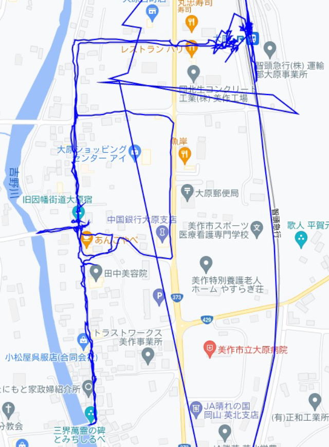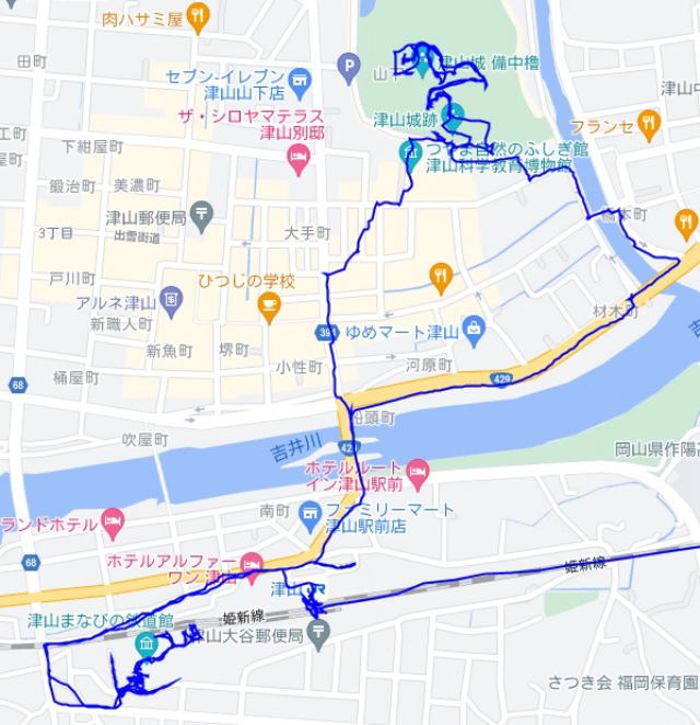 (津山市内の散策。 GPSロガーのログデータで実際に移動した場所の軌跡を表示)