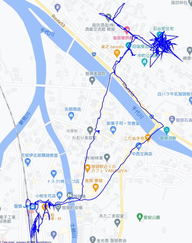 (智頭宿の散策。 GPSロガーのログデータで実際に移動した場所の軌跡を表示)