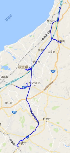青色が実際に移動した軌跡。 ただし、能登川から近江鉄道近江線の途中までは