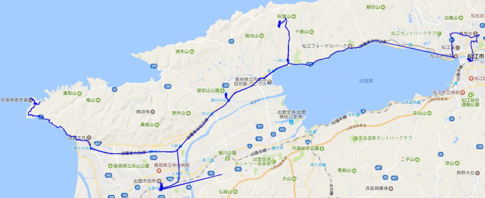 松江しんじ湖温泉-雲州平田(散策)-一畑口-一畑薬師(散策)-一畑口-川跡-電鉄出雲大社-日御碕灯台(散策)-出雲大社連絡…電鉄出雲大社-川跡-電鉄出雲市(泊)