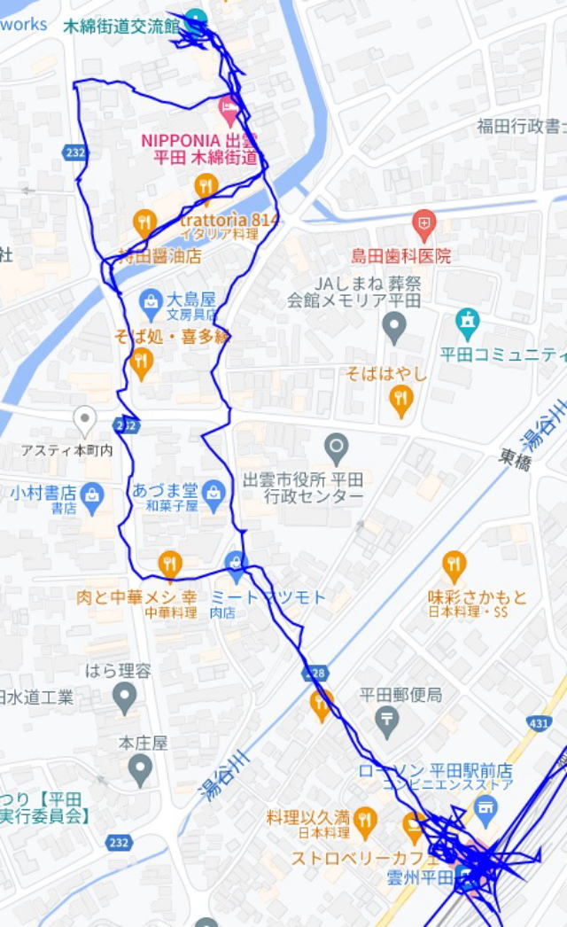 (雲州平田駅周辺 木綿街道の散策。 GPSロガーのログデータで実際に移動した場所の軌跡を表示)