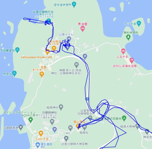 (日御碕灯台の散策。 GPSロガーのログデータで実際に移動した場所の軌跡を表示)