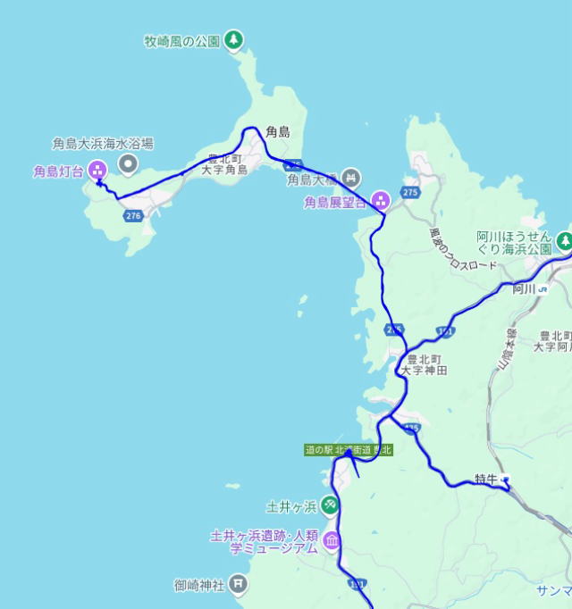 (角島周辺の散策。 GPSロガーのログデータで実際に移動した場所の軌跡を表示)