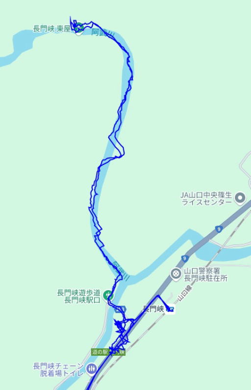 (長門峡の散策。 GPSロガーのログデータで実際に移動した場所の軌跡を表示)