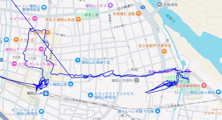 (福知山市内の散策。 GPSロガーのログデータで実際に移動した場所の軌跡を表示)
