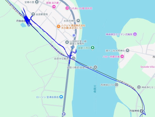 (由良川橋梁周辺の散策。 GPSロガーのログデータで実際に移動した場所の軌跡を表示)