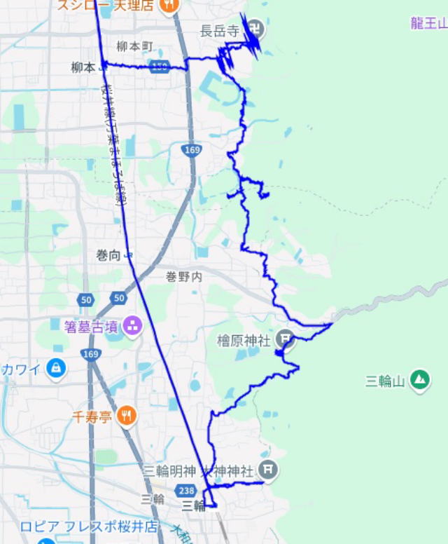 (山辺の道の散策。 GPSロガーのログデータで実際に移動した場所の軌跡を表示)