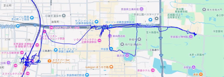 (奈良市内の散策。 GPSロガーのログデータで実際に移動した場所の軌跡を表示)