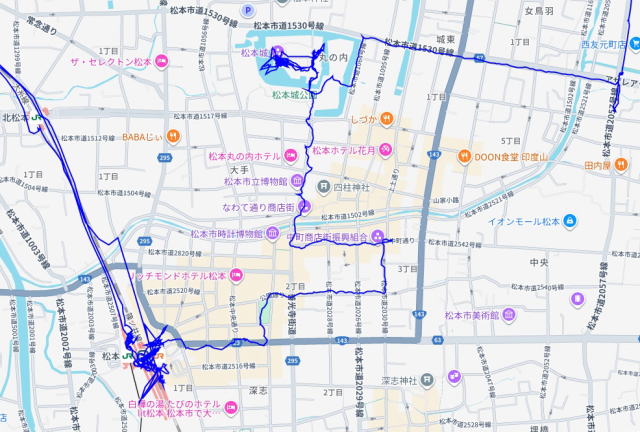 (松本市内の散策。 GPSロガーのログデータで実際に移動した場所の軌跡を表示)