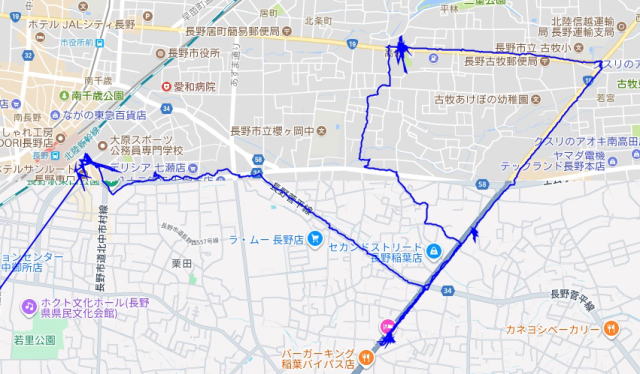 (長野駅周辺の散策。 GPSロガーのログデータで実際に移動した場所の軌跡を表示)